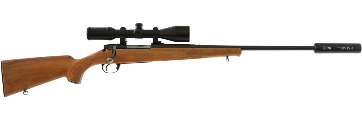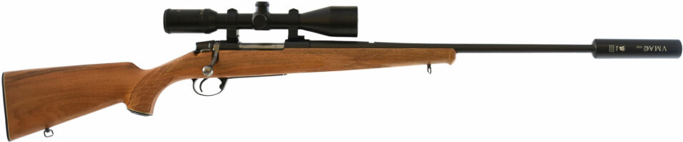 Metall mkt bra skick. Kolv i Mycket bra skick. Vapenpaket, Nytt kikarsikte Scandium 2,5-10x50 Belyst. Warne 30mm montage. Ny ljuddämpare V-mac Bear 2. Ordinarie pris 13300:- Nu 10000:-