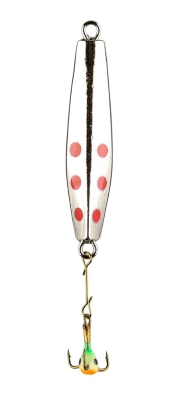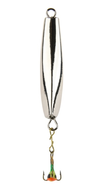 IFISH Svenne 55mm är en avlång vertikalpirk, något smalare än vad bilden visar, för att pimpla abborre, monterad med lystrekrok för ett effektivt pimpelfiske efter abborre.