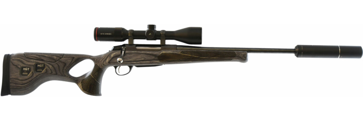 MGT Thumbhole justerbar kolvkam och kolvlängd 36,5-39cm.Kikarsikte Kite optics B6 2-12x50i Belyst. Burris Stålmontage. Ljuddämpare Aimsport Triton 42. Ordinarie paketpris 44900:-. Nu 34900:-